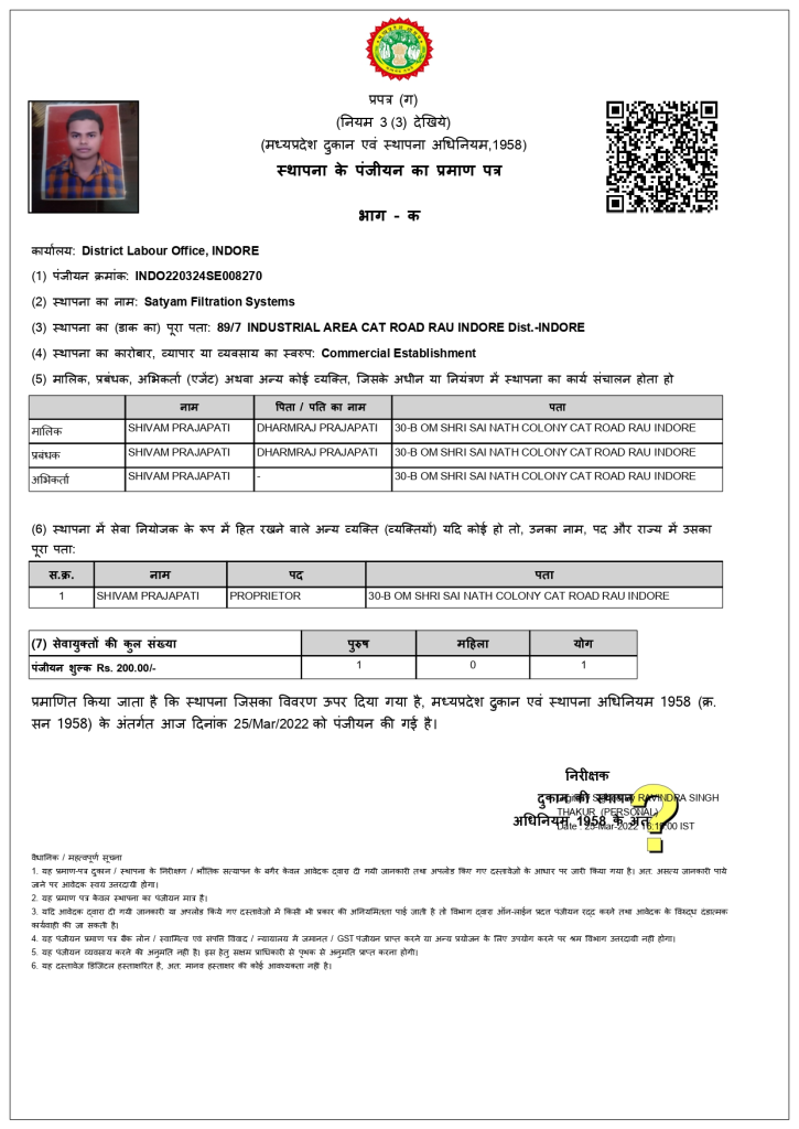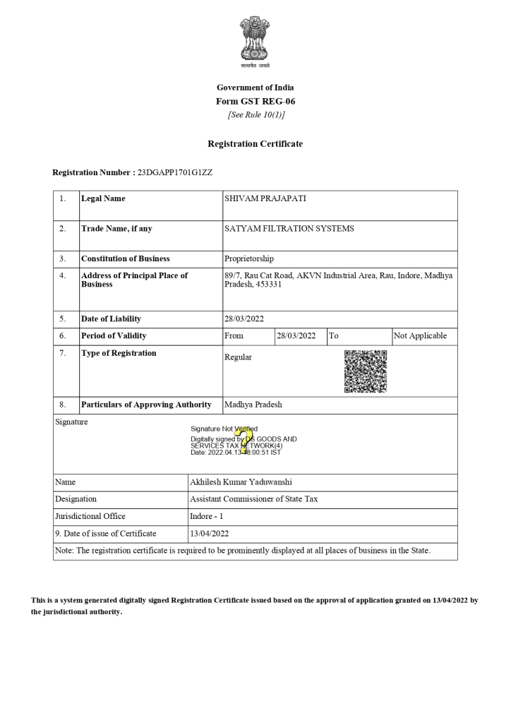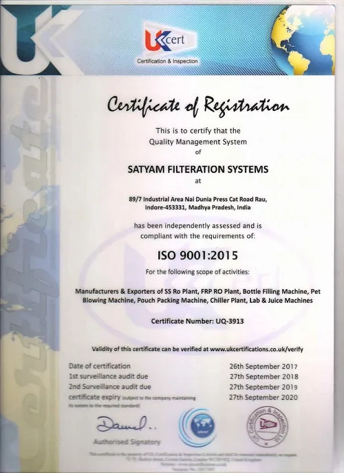 Certificate : satyam filtration system